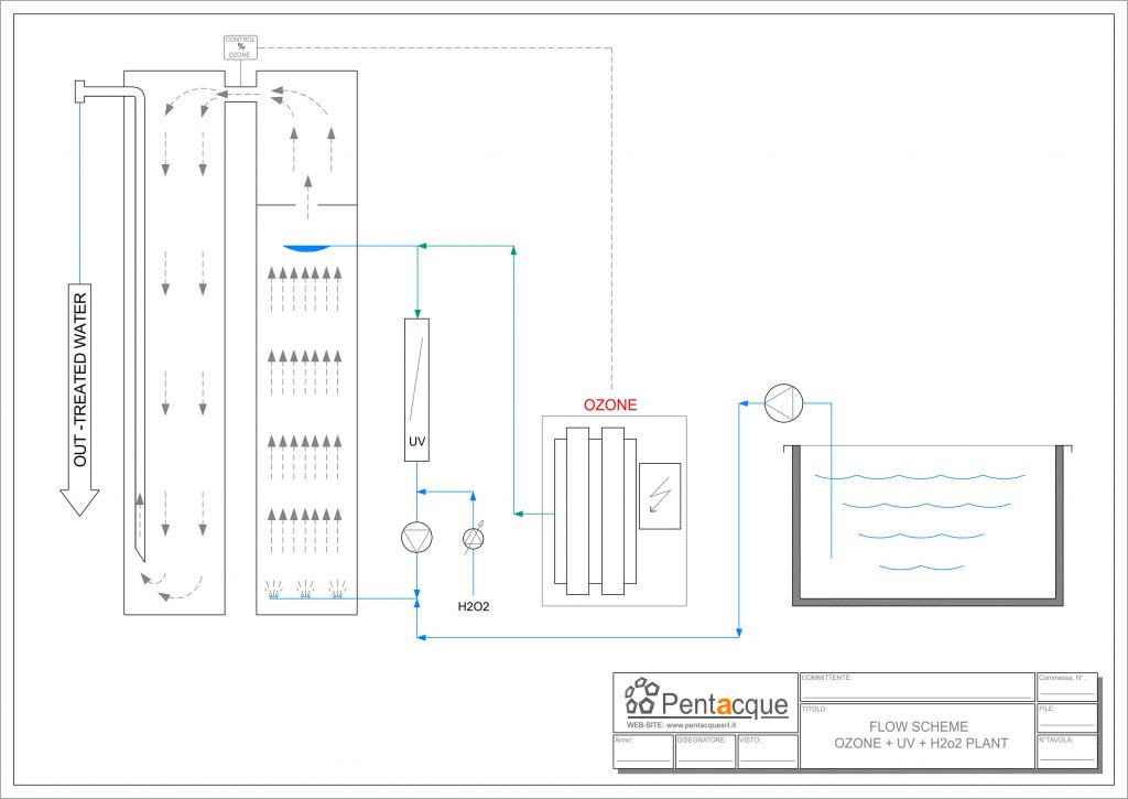 These plants are equipped with ozone generator, injection system by pump or venturi for ozone gas suction, vertical tubular reaction reactor, internal wastewater recycling pump to increase and complete the ozone oxidation reaction.