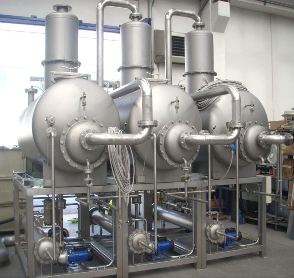 Pentacque also proposes multi-stage or multi-effect evaporation concentration plants; this type of evaporator concentrators, fed by hot water or steam or other heat sources, realize the desired evaporation in a first tank, and use the thermal energy of condensation to heat the second tank. The resulting thermal energy is further used to heat the liquid in the third cylinder of the concentrator. By modulating the type of exchange and the relative exchanger, the chosen caloric value is completely used. The condensation is normally carried out through a closed cooling circuit with forced ventilation.